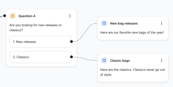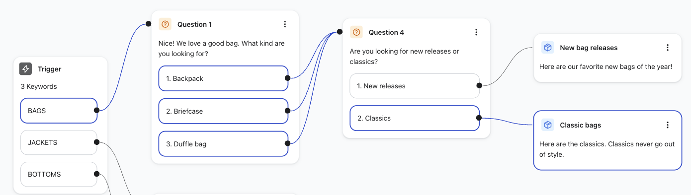 - Du kan till exempel ställa en ny uppsättning frågor eller skicka ett enda meddelande, om någon svarar med "Väskor" " Jackor" eller "Bottoms"