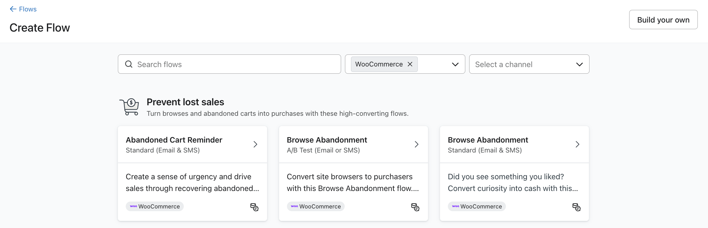 - Skapa två separata övergivna kundvagnar: en som utlöses av WooCommerce:s kassahändelse (färdigbyggd-flödet som anges ovan) och en som utlöses av Buy with Prime:s kassahändelse. För ditt Buy with Prime-flöde, läs Hur man skapar ett övergiven kundvagn-flöde för Amazon Buy with Prime.