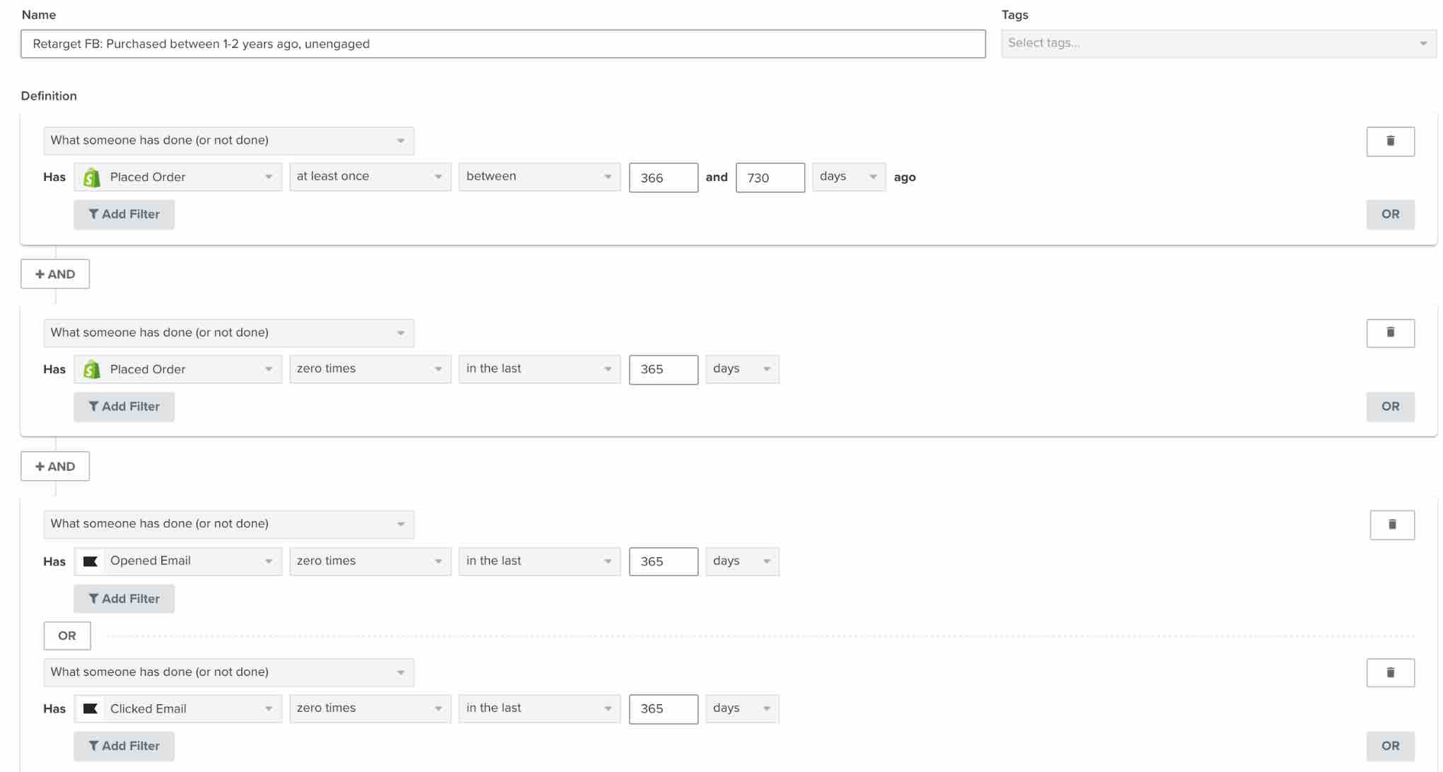 Potentiella varumärkesentusiaster har valt att ta emot e-postkommunikation, köpt under de senaste 4 månaderna, men har inte spenderat en enorm summa pengar på produkter (justera din segment för att återspegla din prissättning). Nedan följer ett exempel på ett segment som ska synkroniseras med en Meta anpassad publik så att du kan konvertera dem till varumärkesentusiaster.
