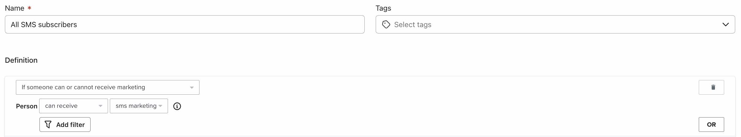 Du kan också segment din sms-prenumerant baserat på deras telefonnummers landskod. För mer information, kassa den här artikeln om segment sms prenumerant per land.