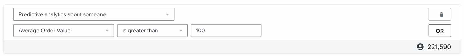 För att rikta in dig på kund med högt värde (t.ex. kund med ett genomsnittligt ordervärde på över $100), lägg till följande villkor på din segment: