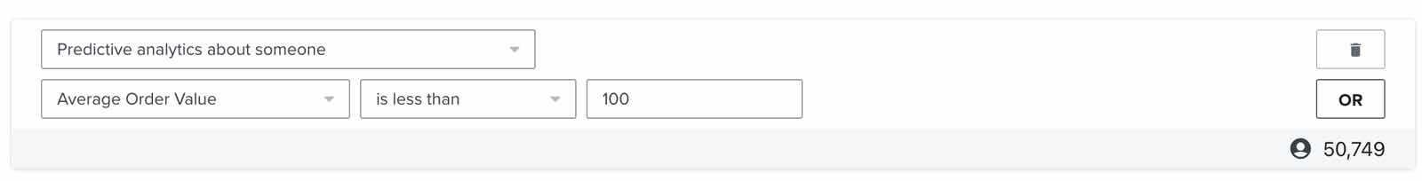 För att rikta in dig på kund med lågt värde (t.ex. kund med ett genomsnittligt ordervärde på under 100 USD) lägger du till följande villkor på din segment: