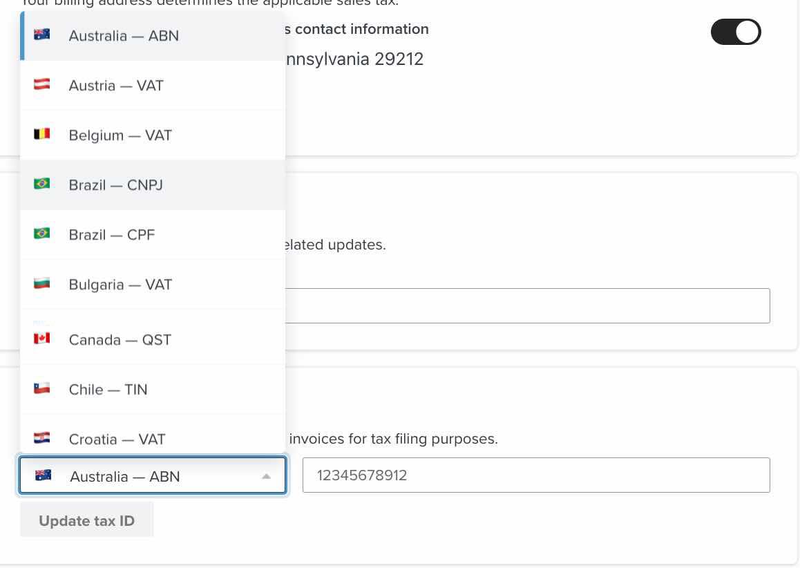 Vi kommer att försöka fastställa och förifylla skatte-ID-typen baserat på landskoden och eventuell tillhörande logik som vi har för ditt företag. Om du av någon anledning behöver ändra eller lägga till typ av skatte-ID väljer du det alternativ som passar bäst för det land där du bedriver verksamhet.