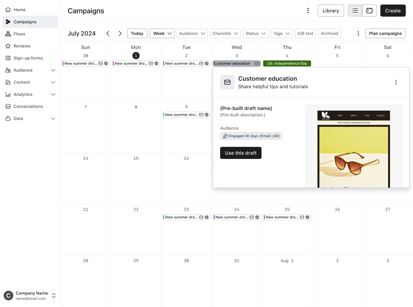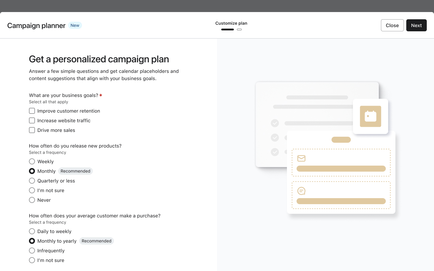 Lär dig hur du använder Klaviyo:s kampanjplanerare för att skapa ett personligt kampanjabonnemang. Kampanjplaneraren kommer att fylla din kampanjkalender med platshållare efter att du har angett information om ditt varumärke.