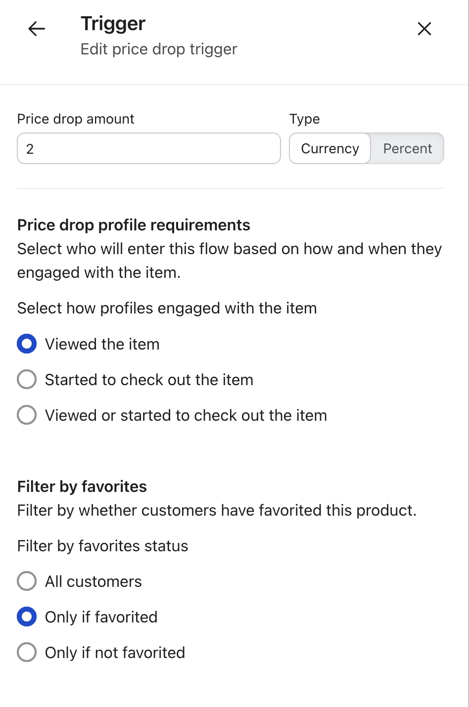 Detta är särskilt användbart för ett prissänkningsflöde: genom att välja Endast om det är favoritmarkerat, kan du säkerställa att prissänkningsmeddelanden skickas exklusivt till kunder som har visat det starkaste intresset för den produkten, vilket gör meddelandet mer relevant och lägligt.
