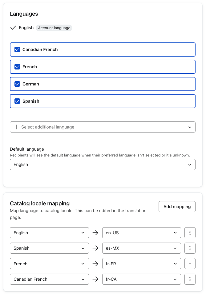 Alla språk som du lägger till i avsnittet Language kommer automatiskt att fyllas i som alternativ när du översätter mall, campaigns, flöde och Universalinnehåll. Alla lokalmappningar som du lägger till i avsnitten Lokalmappning i katalogen kommer automatiskt att användas som reservlokal för varje språk när en profils land är okänt eller det inte finns några katalogdata för profilens land.