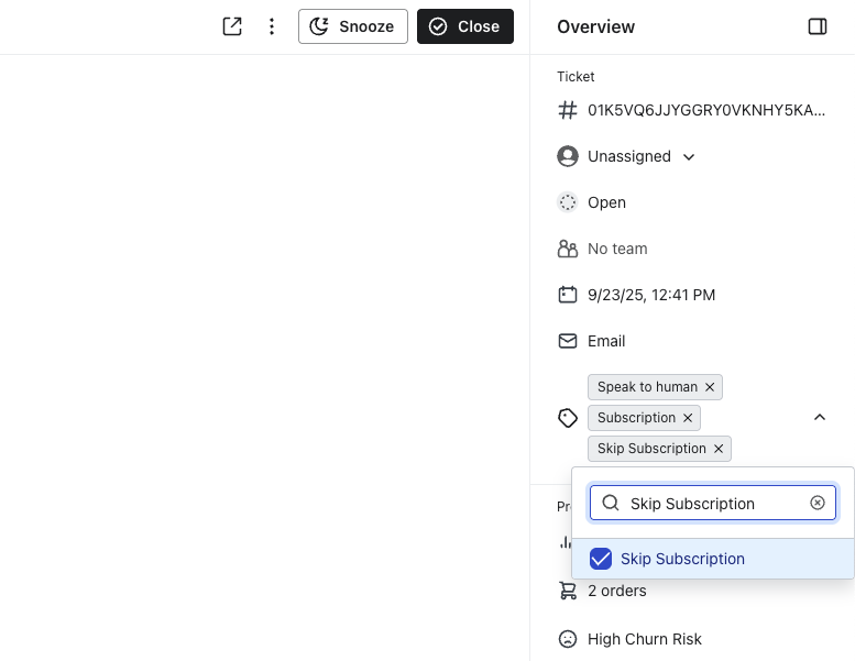 Automatiska etiketter kan inte inaktiveras, men du kan ta bort dessa etiketter efter behov när de har lagts till. När en biljett är auto-etikett, visas endast de specifika fördefinierade etiketter som lagts till av Klaviyo i etikettmenyn i biljetten, tillsammans med eventuella anpassade etiketter som du har skapat. Den fullständiga listan över fördefinierade etiketter visas inte som alternativ i rullgardinsmenyn.