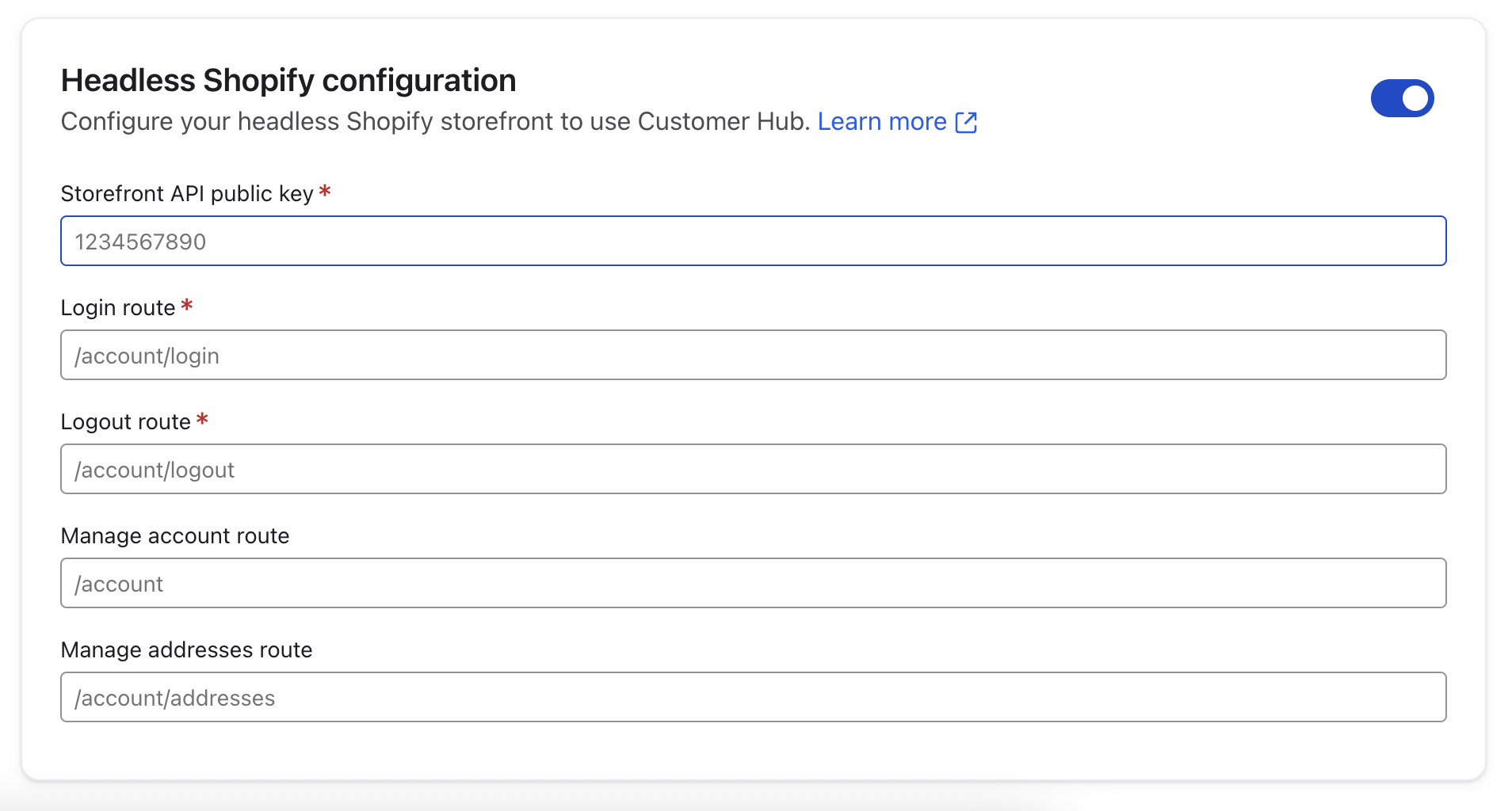 Om du väljer Shopify Customer Konto API anger du även inloggning, utloggning och valfria Hantera konto/Hanteraadresser-vägar för din butik (används för omdirigeringar mellan hubben och din webbplats).