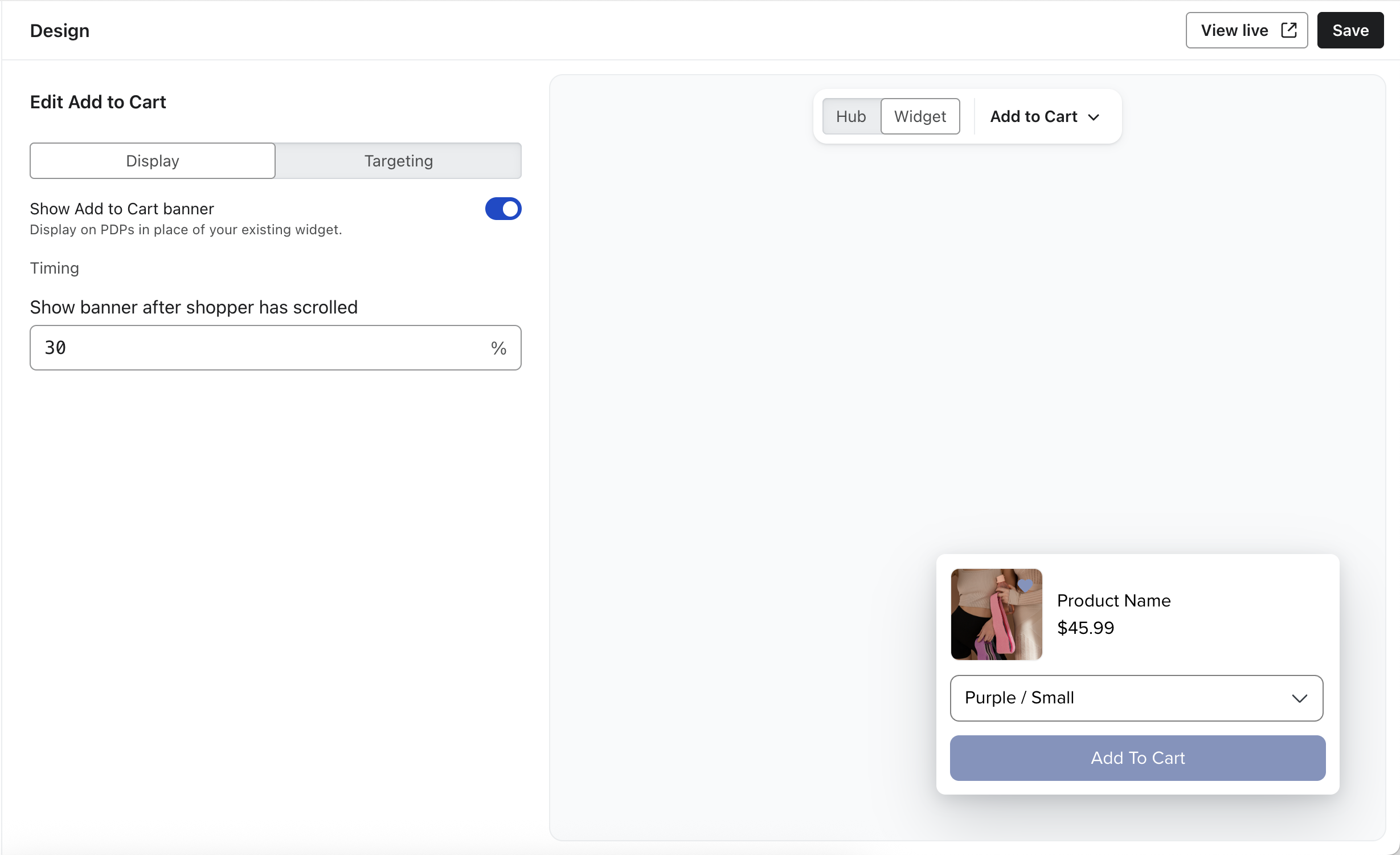 - I menyn Display kan du aktivera bannern Add to Cart och välja hur långt ner på sidan en kund måste scrolla innan widget visas (mätt som en procentandel av sidans höjd).