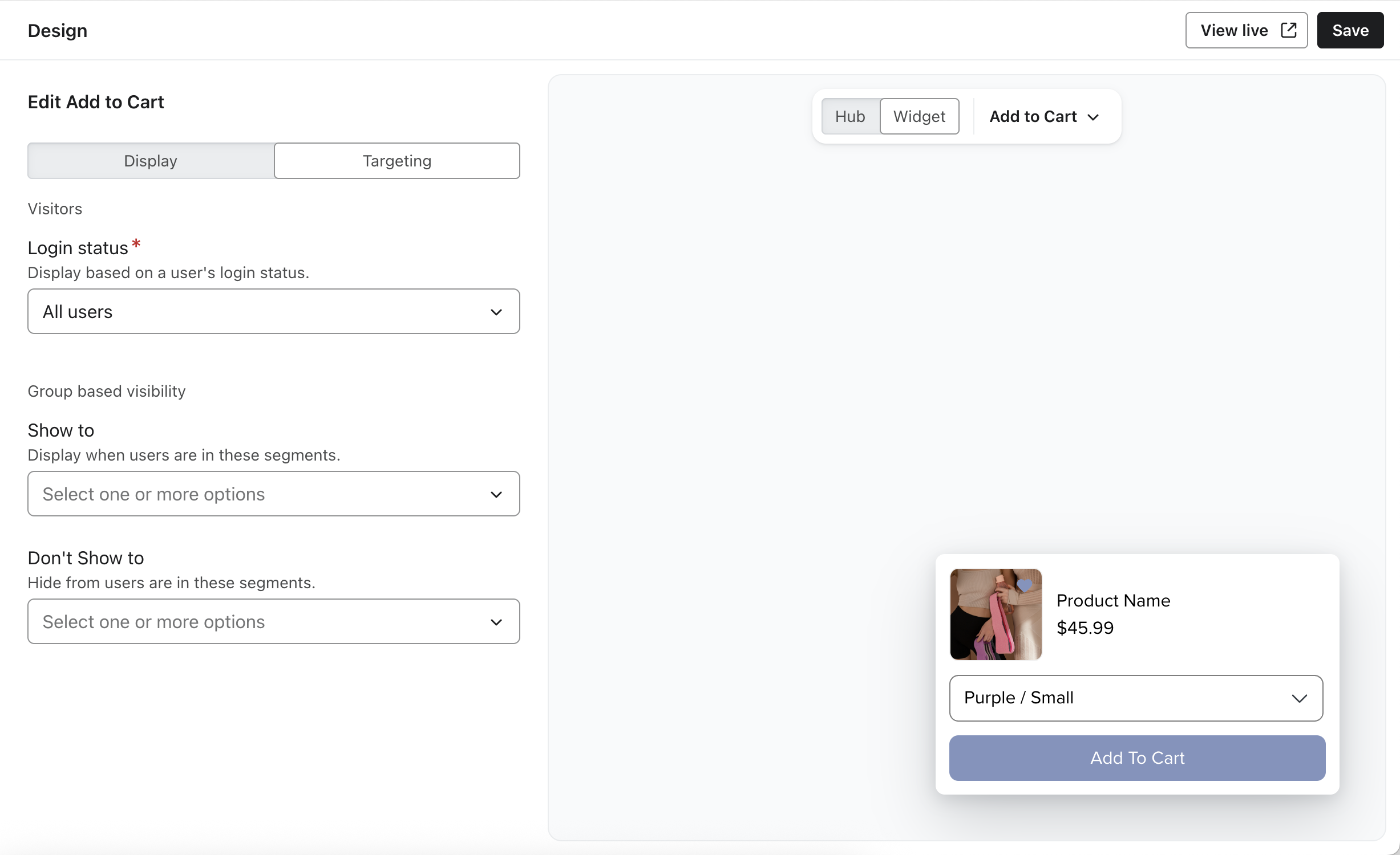 - Välj widget och sedan vyn Lägg till i kundvagn högst upp i förhandsgranskningen