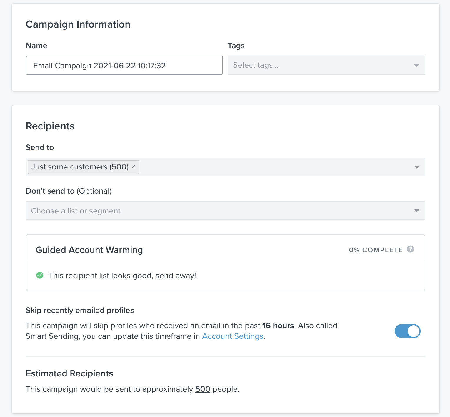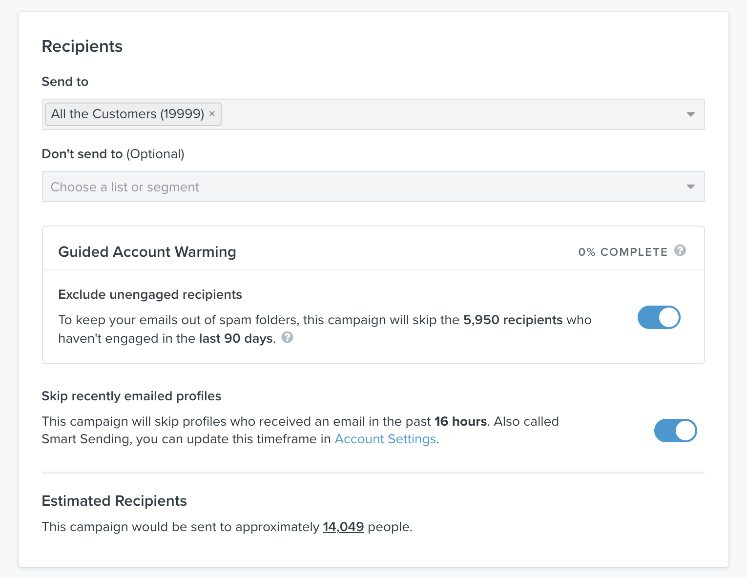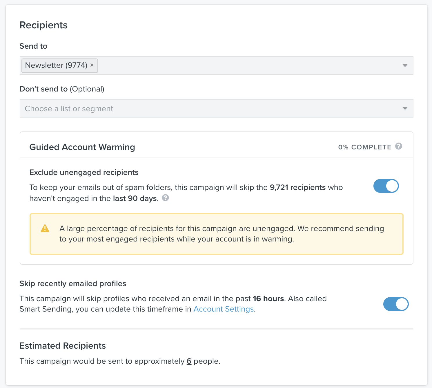 Vi rekommenderar starkt att du följer dessa guidad uppvärmning-förslag om de visas på ditt Konto. Med det sagt kan du välja att inkludera Oengagerad-publiken genom att slå av inställningen för guidad uppvärmning. Om du till exempel har en juridisk skyldighet att kontakta alla som har köpt en viss produkt, eller om du skickar till en uppladdad lista över profiler som du inte har engagemangsdata för i Klaviyo, kan du behöva ignorera detta förslag.