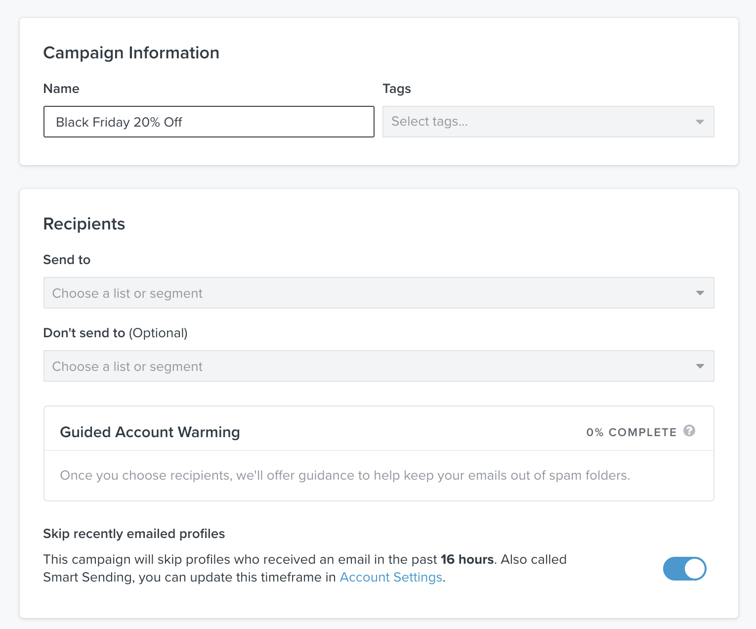 Om du är i uppvärmningsprocessen och har minst 5.000 profiler men inte uppfyller övriga förutsättningar för guidad uppvärmning, kommer du ändå att få information om att du är i uppvärmningsprocessen. I detta fall kommer du att se en banner på kampanjens sändningssida som informerar dig om att ditt Konto är i uppvärmning och en status (t.ex. 10% genom uppvärmning) för att hjälpa dig att följa dina framsteg.