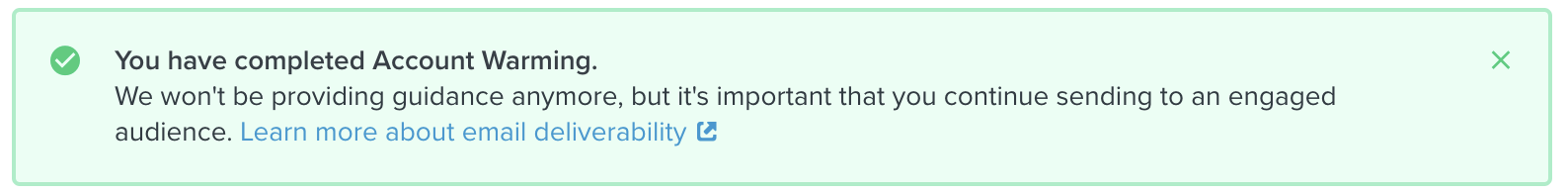 När du är klar med uppvärmningsprocessen visas ett meddelande om att du har lyckats. Meddelandet kommer att informera dig om att du har slutfört uppvärmningen och kan få ytterligare information om hur du upprätthåller ett hälsosamt avsändarrykte.