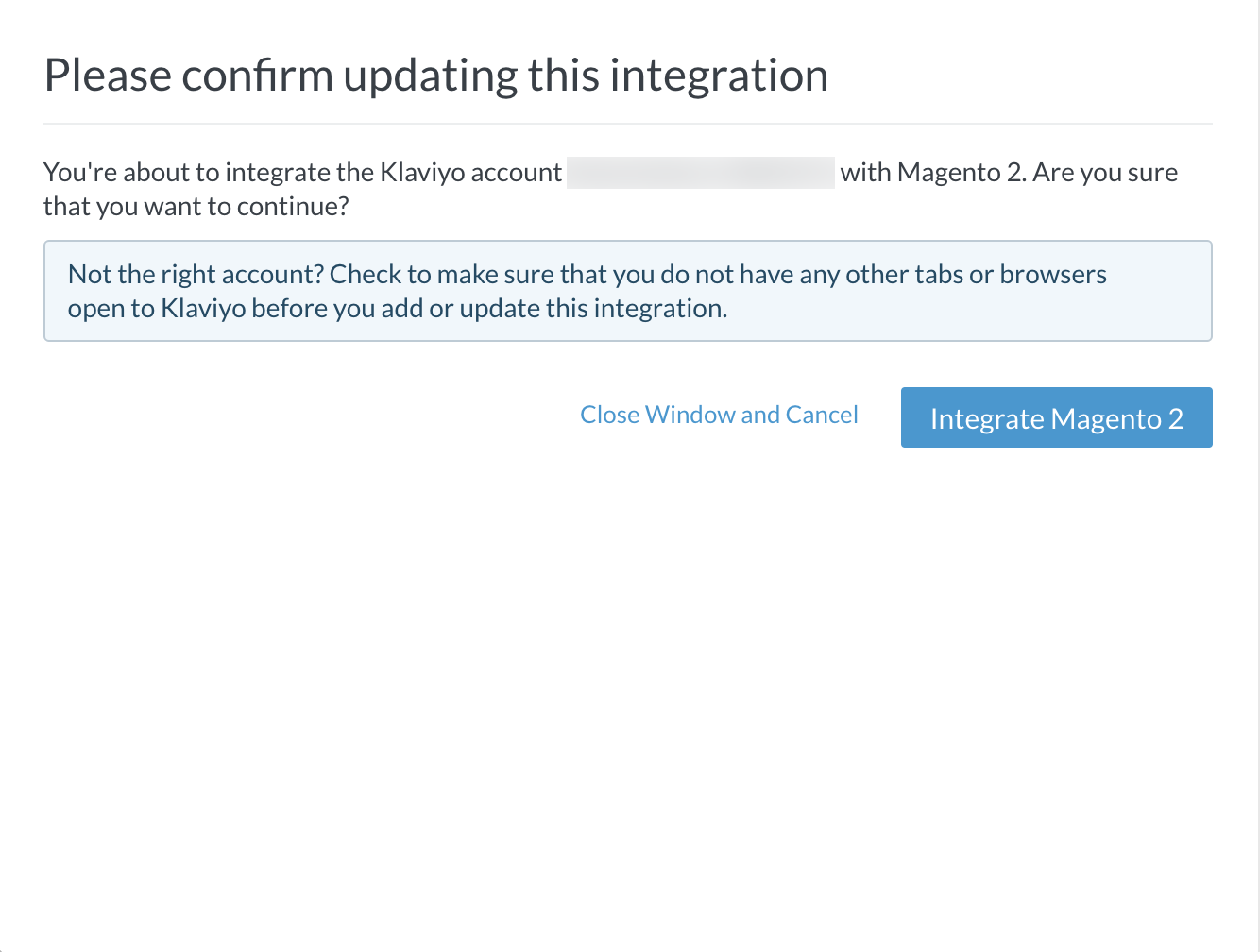 Logga in om du inte redan har gjort det, eller bekräfta att ditt Kontonamn och ID är korrekta och klicka på Integrera Magento 2. Detta kommer att lägga till Magento 2 integrationer till din Klaviyo Konto associerad med API-nyckel som du använde för installation. Om du är inloggad på flera Klaviyo Konto och det korrekta Kontot inte visas, logga ut från alla andra sessioner.