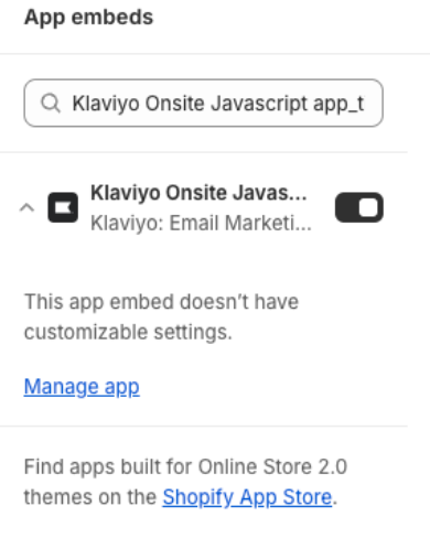 - Du kommer till fliken Appinbäddningar i din temainställning. Kontrollera att Klaviyo-appinbäddning är aktiverat.