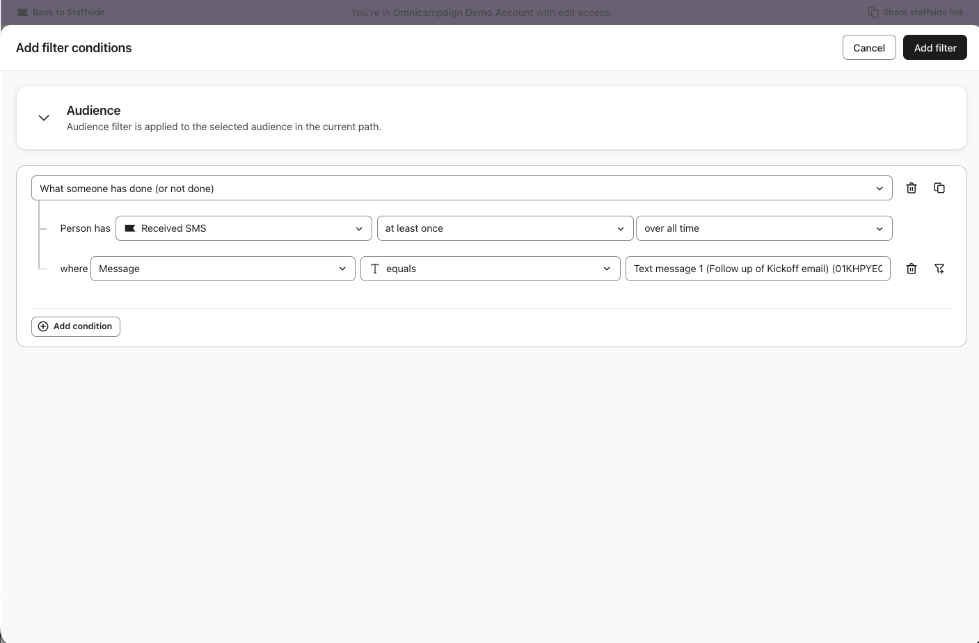 Tips: Uppföljningsfunktionerna är ett verktyg för snabb start. När meddelandet har skapats har du full tillgång till att redigera målgruppsfiltren - justera engagemangsfönstret, lägga till villkor eller byta ut filtren helt och hållet. Navigera till avsnittet Målgruppsfilter i uppföljningsmeddelandet för att göra ändringar.
