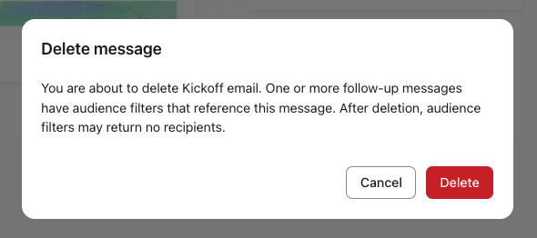 Om du tar bort ett meddelande som har uppföljningar som hänvisar till det, visas en varningsmodal som informerar dig om att nedströmsmeddelanden har filtervillkor knutna till det här meddelandet.