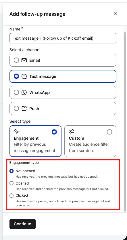 Alternativ för engagemang skapar automatiskt målgruppsfilter baserat på hur mottagarna interagerade med källmeddelandet. Vilka alternativ du ser beror på vilken kanal källmeddelandet använder.