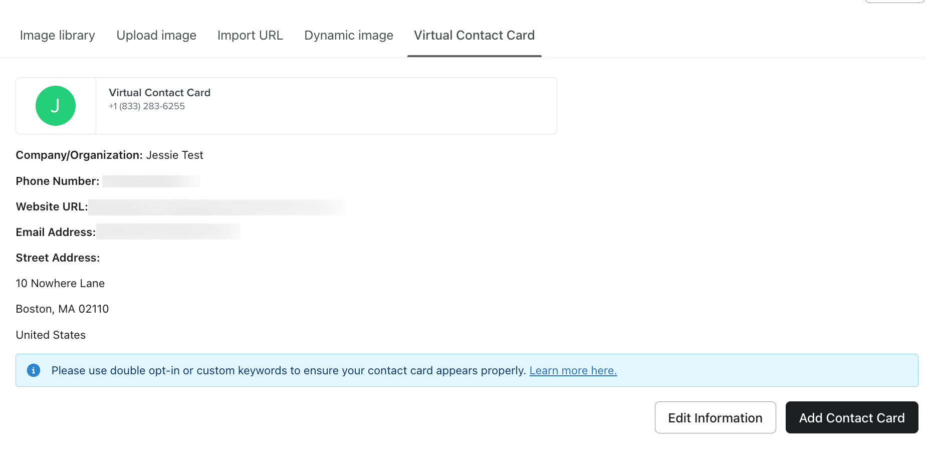 mottagare måste ha sms:at ditt nummer tidigare för att virtuella kontaktkort ska visas korrekt. Av denna anledning rekommenderar vi att du använder dubbel opt-in för din sms-lista eller anpassad Nyckelord för att säkerställa att din kund har smsat ditt nummer för att prenumerera.